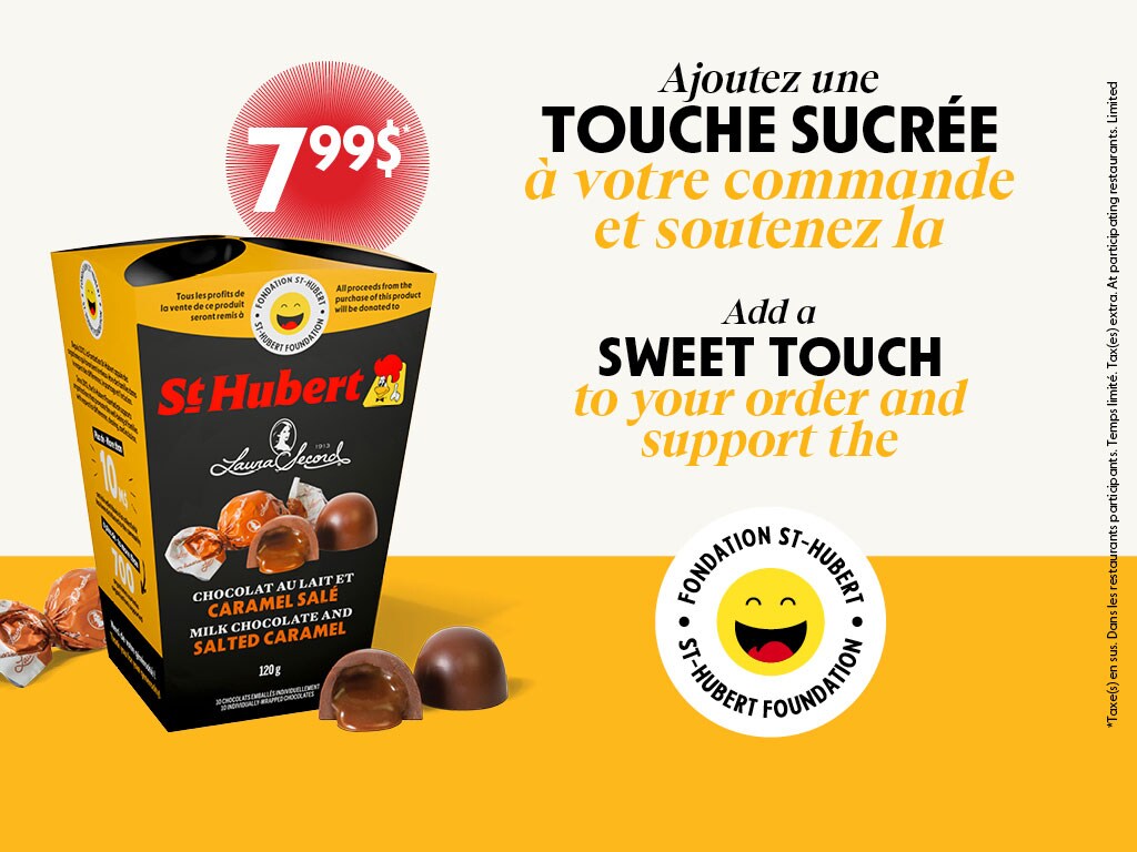 A touch of sweetness for a good cause! All proceeds from the purchase of this product will be donated to the St-Hubert Foundation.Milk chocolate and salted caramel; 120 g per box; 10 individually-wrapped chocolates; Contains: milk, soy; Peanut Free.Limited time. While supplies last.