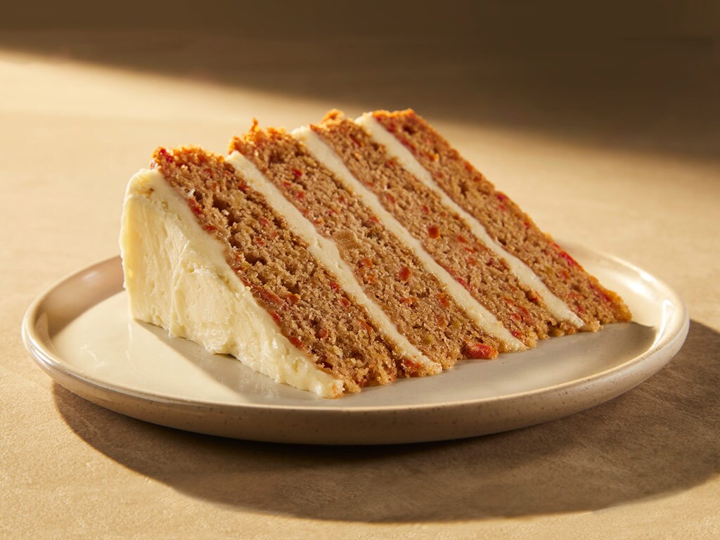 A generous cake of fresh carrots and pineapple, with four layers, each covered with a rich, authentic cream cheese icing. Suggested serving.