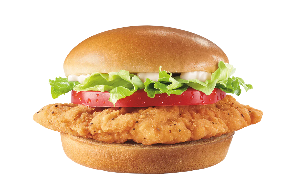 A crispy chicken fillet topped with crisp chopped lettuce, thick-cut tomato and mayo served on a warm toasted bun.