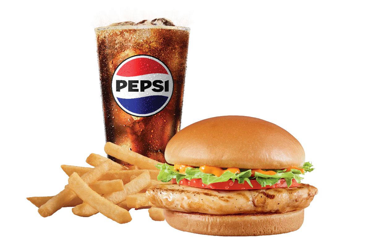 All white meat seasoned grilled chicken filet topped with lettuce, tomato and FlameThrower® sauce, served on a warm toasted bun. Served with fries and a 21oz drink.