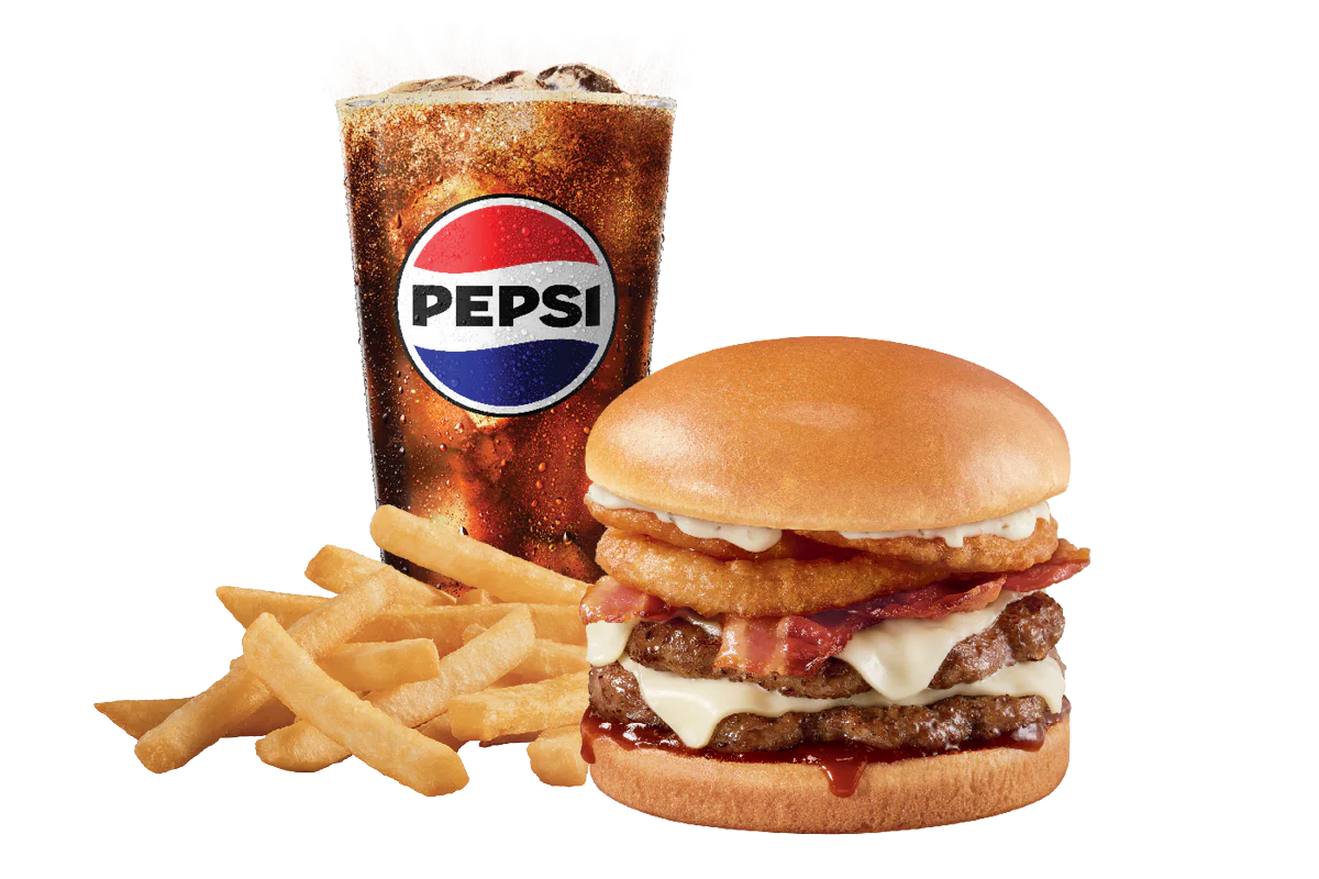 Price includes one Stackburger™, choose a single, double or triple. Single, Double (1/3lb*) or triple (1/2lb*) 100% seasoned real beef patties, topped with Honey BBQ sauce, ranch, crispy golden onion rings, applewood smoked bacon, two slices of perfectly melted White Cheddar** served on a soft and toasted bun. Served with fries and a 21oz drink. * Precooked weight **Processed cheese product
