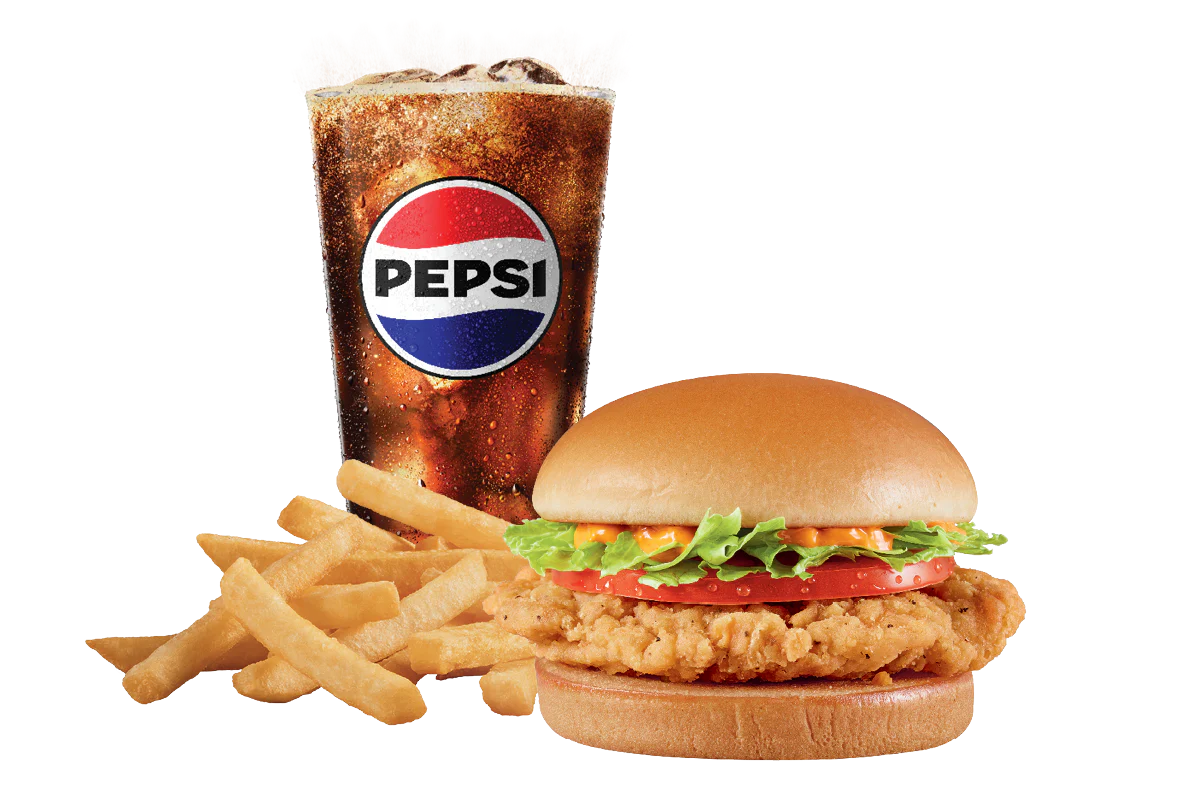 An all white meat marinated crispy chicken fillet topped with crisp lettuce, tomato and FlameThrower® sauce served on a warm toasted bun. Served with fries and a 21oz drink.
