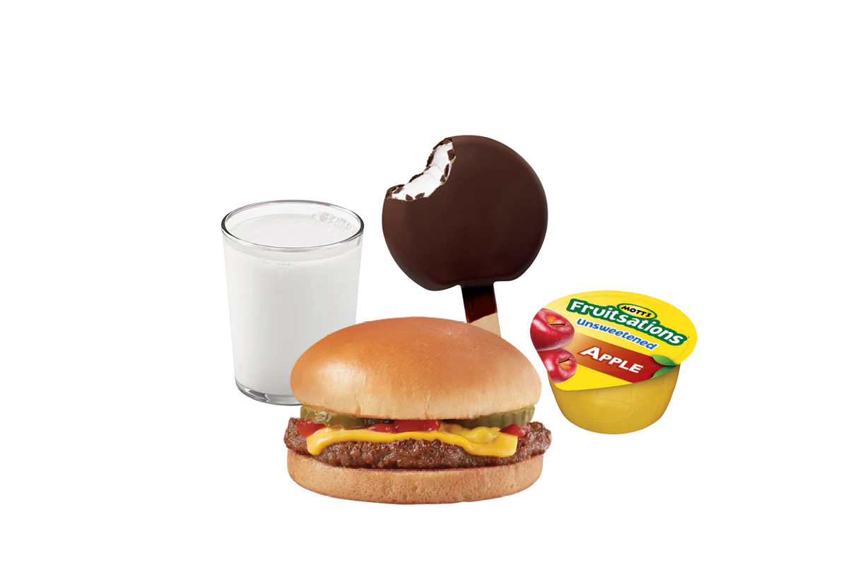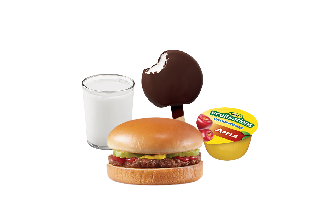 One 100% beef patty, pickles, ketchup and mustard served on a warm toasted bun. Served with a Kids sized French fries, applesauce or banana; small 2% Milk and a dessert.