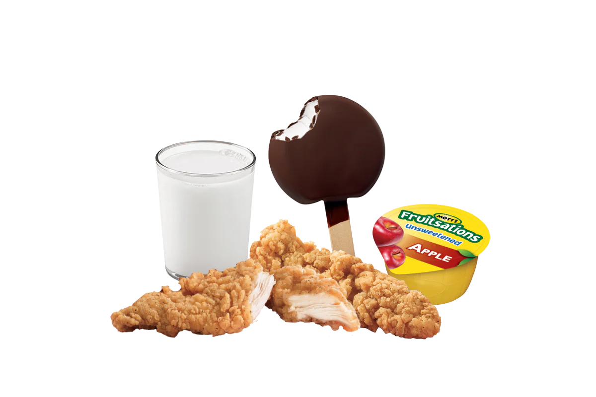 A DQ® signature, 100% all-tenderloin white meat chicken strips are served with your choice of dipping sauce. Served with a Kids sized French fries, applesauce or banana; small 2% Milk and a dessert.