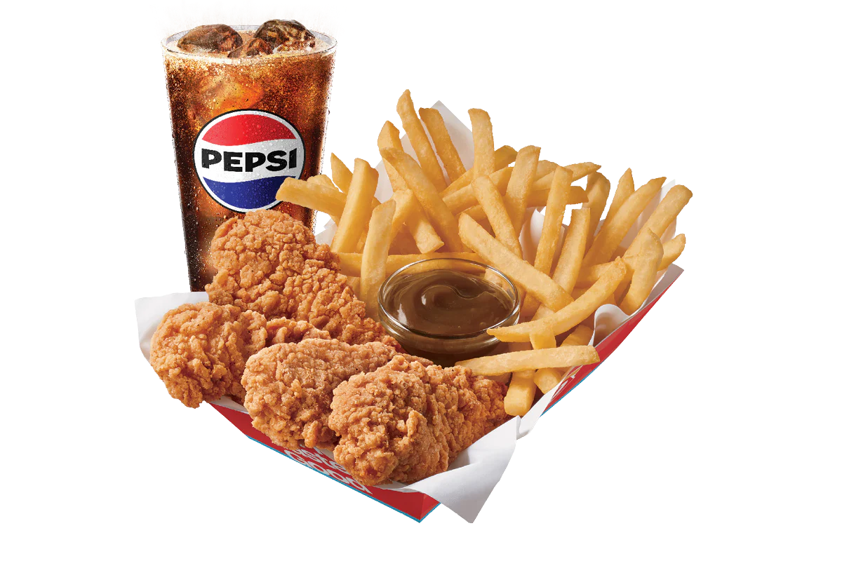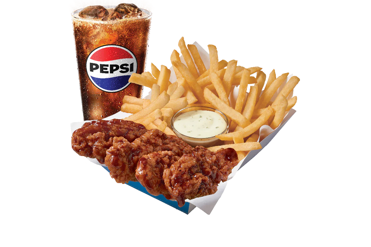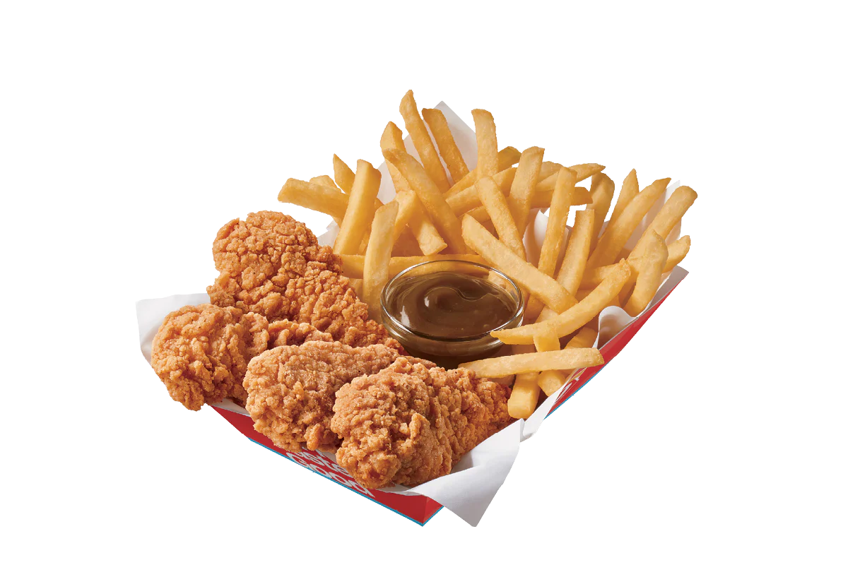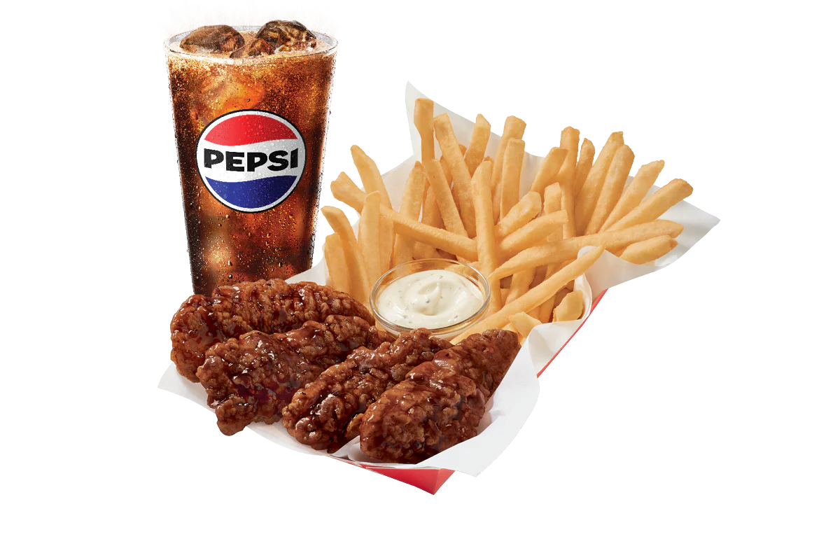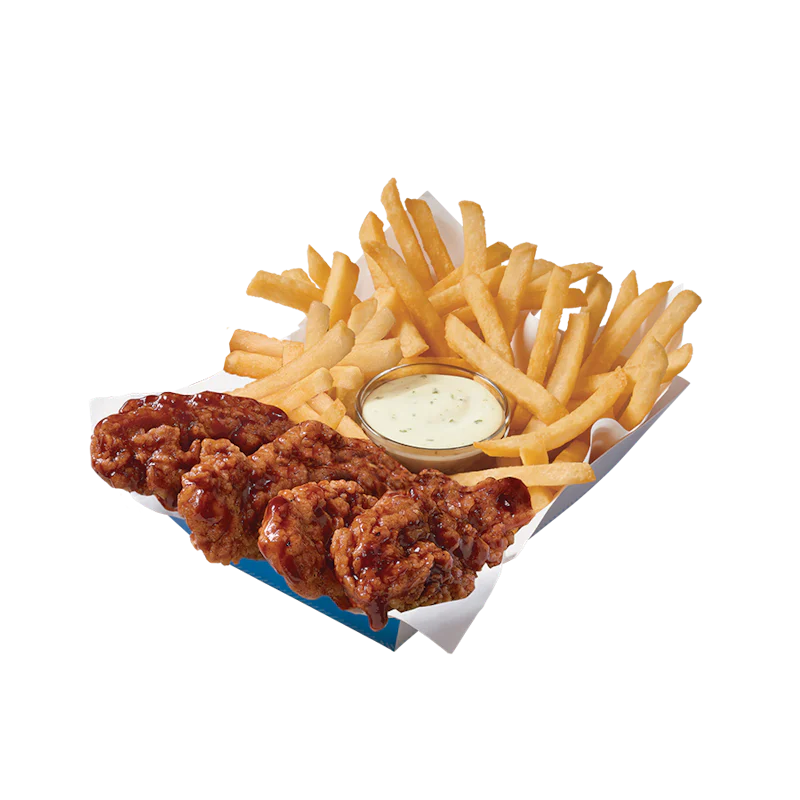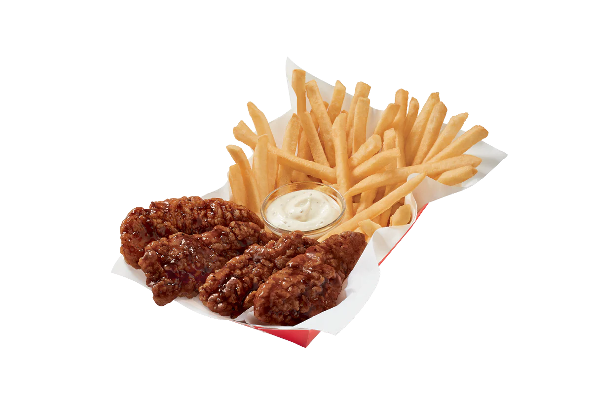 DQ® signature 100% white meat seasoned tenderloin chicken strips sauced & tossed in classic Honey BBQ sauce, served with fries, 21oz drink and your choice of dipping sauce. Available in a 4 or 6 piece basket.