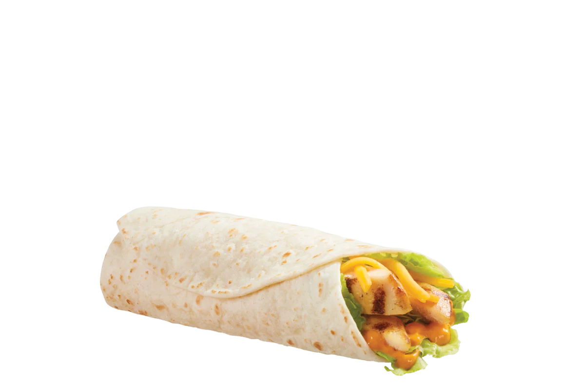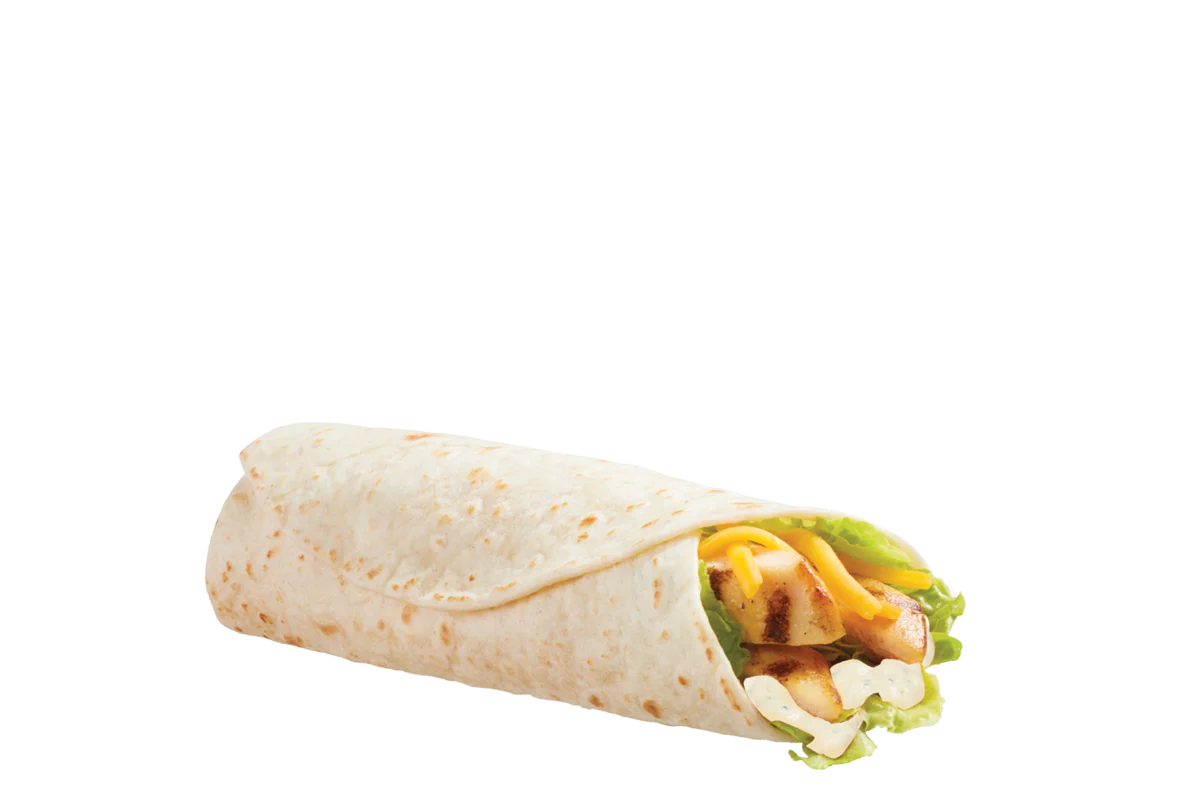 Grilled all white meat seasoned chicken strip with crisp lettuce, shredded cheddar cheese and creamy ranch dressing all wrapped in a flour tortilla.