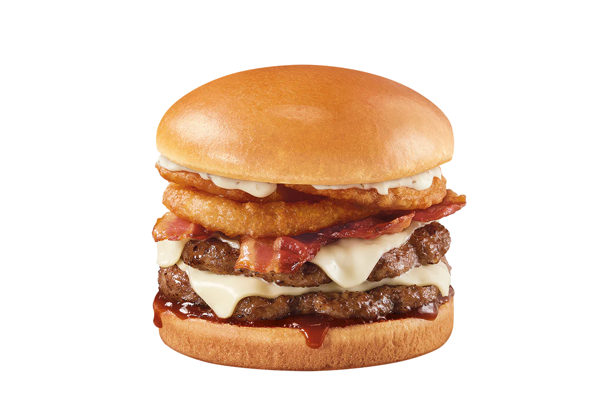 Price includes one Stackburger™, choose a single, double or triple. Single, Double (1/3lb*) or triple (1/2lb*) 100% seasoned real beef patties, topped with Honey BBQ sauce, ranch, crispy golden onion rings, applewood smoked bacon, two slices of perfectly melted White Cheddar** served on a soft and toasted bun. * Precooked weight **Processed cheese product
