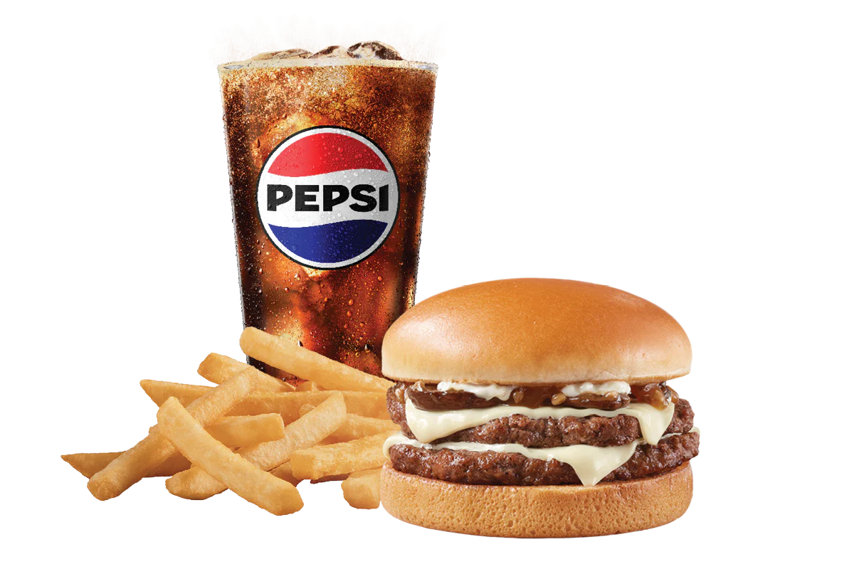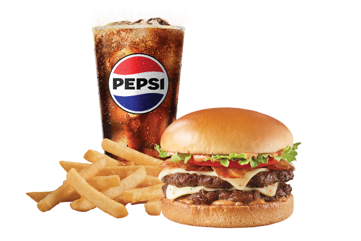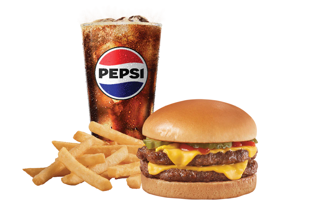 Price includes one Stackburger™, choose a single, double or triple. Single, Double (1/3lb*) or triple (1/2lb*) 100% seasoned real beef patties, topped with perfectly melted cheese**, pickles, ketchup and mustard on a soft and toasted bun. Served with fries and a 21oz drink. * Precooked weight **Processed cheese product
