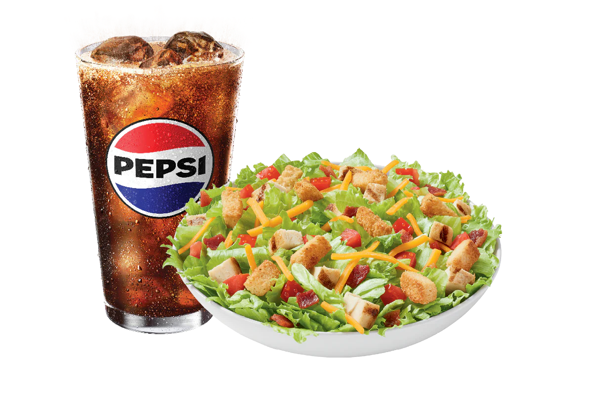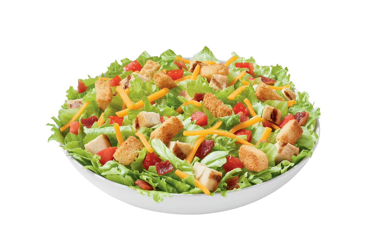 All white meat seasoned grilled chicken served on top of a crisp bed of lettuce, diced tomatoes, bacon, shredded cheddar and croutons. Served with your choice of dressing and a 21oz drink. (Bacon bits may not be available at all locations)