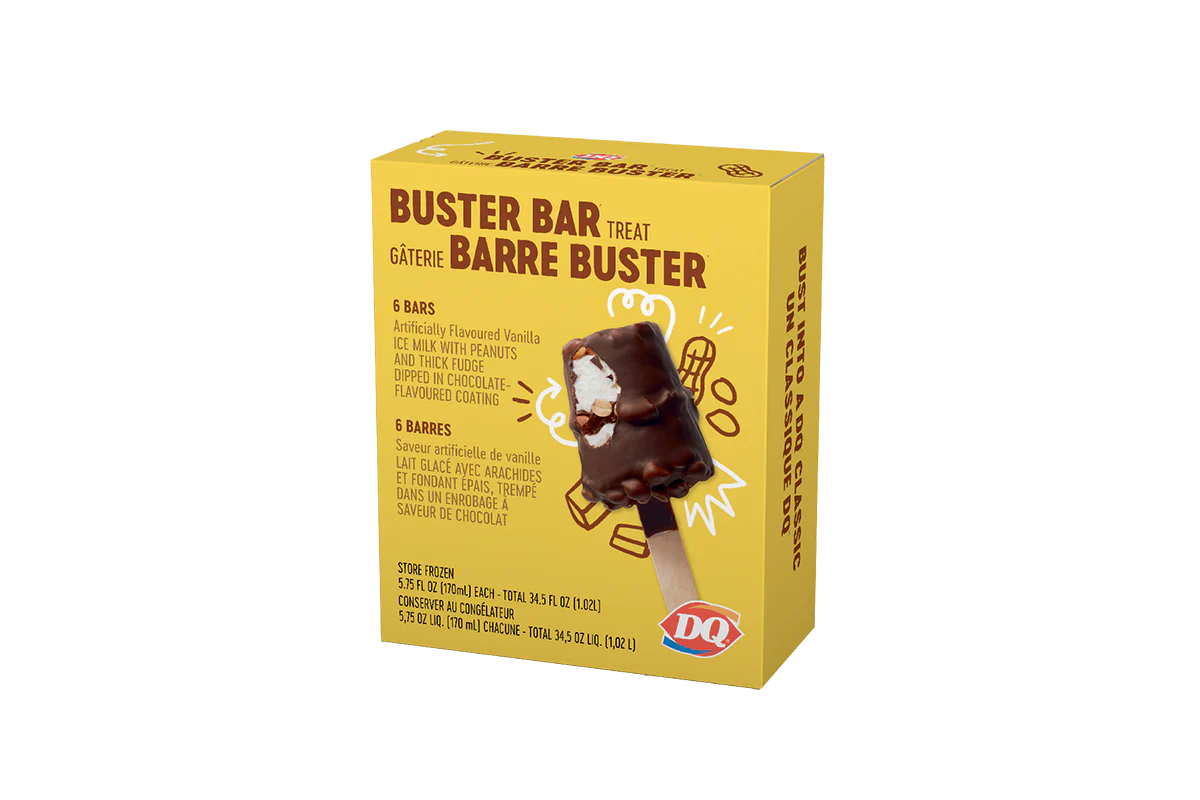 A fresh take on our classic PEANUT BUSTER® Parfait, the BUSTER BAR® is made with layers of cold, creamy DQ® vanilla soft serve, rich fudge, and crunchy peanuts all dipped in our crunchy chocolate cone coating. This nutrition information is for manufactured DILLY® Bars and BUSTER BAR® treats, which are packaged in clear plastic. See packaging for DILLY® Bars and BUSTER BAR® treats in paper bags.