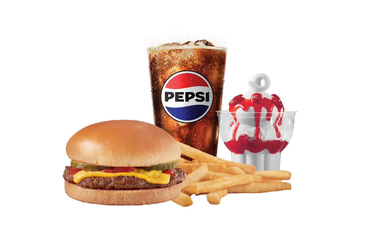100% all beef patty topped with processed cheddar cheese, pickles, ketchup and mustard served on a warm toasted bun. Meal is served with fries, a drink and a Sundae!