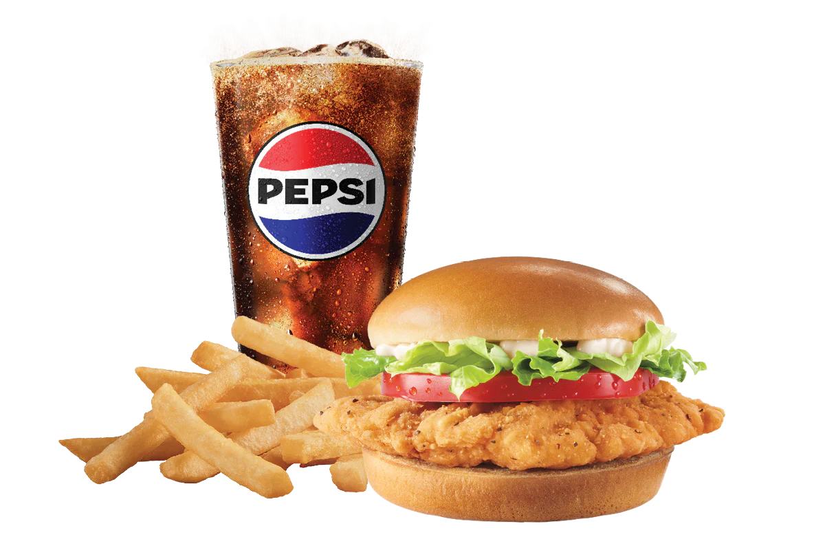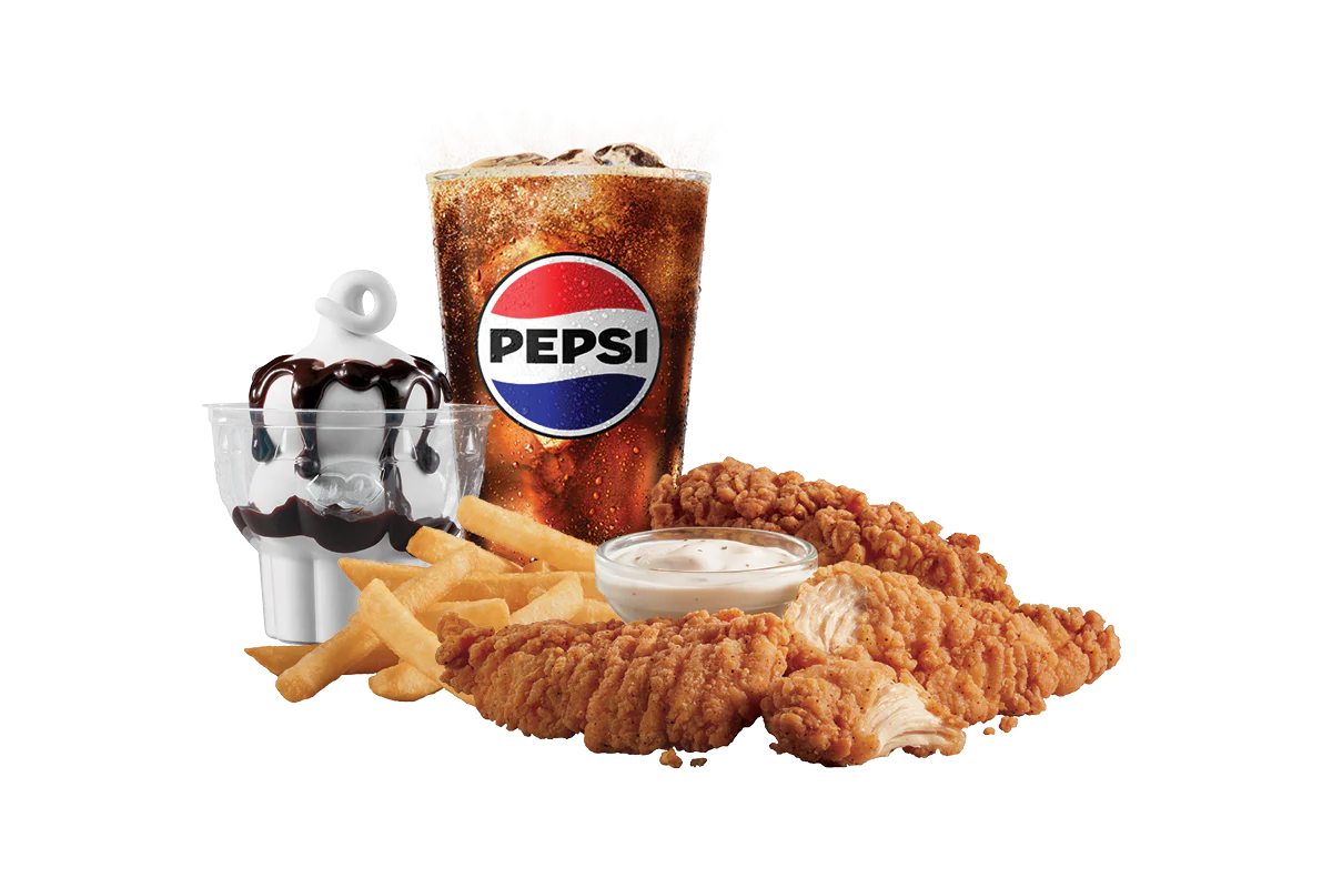 100% seasoned white meat tenderloin strips served with your choice of dipping sauce. Meal is served with fries, a drink and a Sundae!