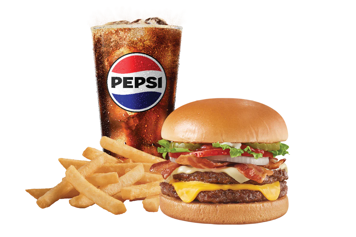 Price includes one Stackburger™, choose a single, double or triple. Single, Double (1/3lb*) or triple (1/2lb*) 100% seasoned real beef patties, topped with two types of perfectly melted cheese**, crispy Applewood smoked bacon, juicy tomato, white onion, crisp lettuce and pickles with ketchup and mayo on a soft and toasted bun. Served with fries and a 21oz drink. *Precooked weight **Processed cheese product