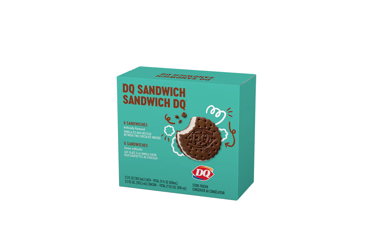 Bite into a DQ® Sandwich and taste the sensation of cool DQ® soft serve nestled between two chocolate flavoured wafers