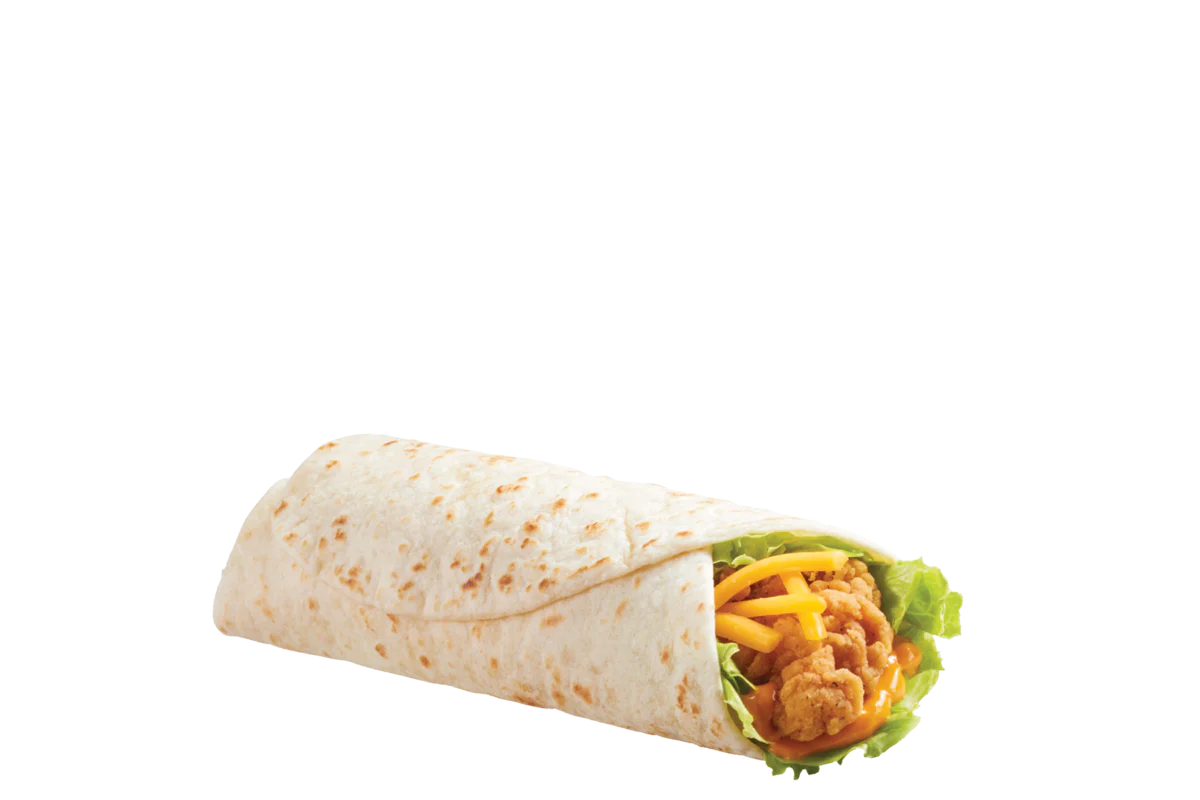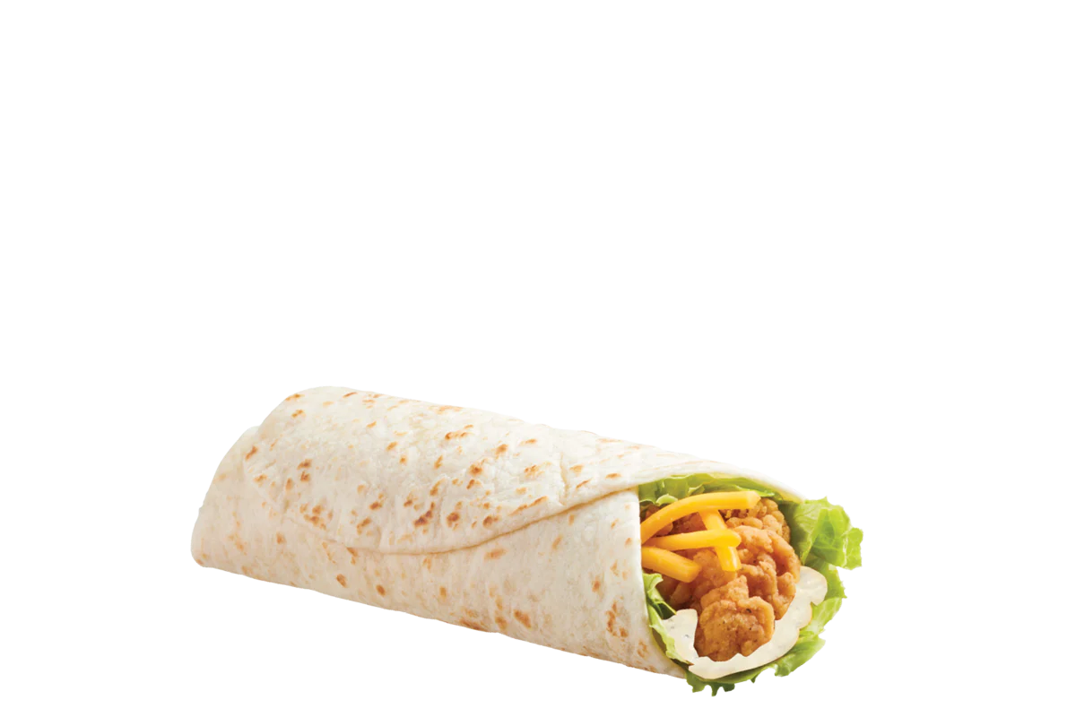 Crispy all white meat seasoned chicken strip with crisp lettuce, shredded cheddar cheese and creamy ranch dressing all wrapped in a flour tortilla.