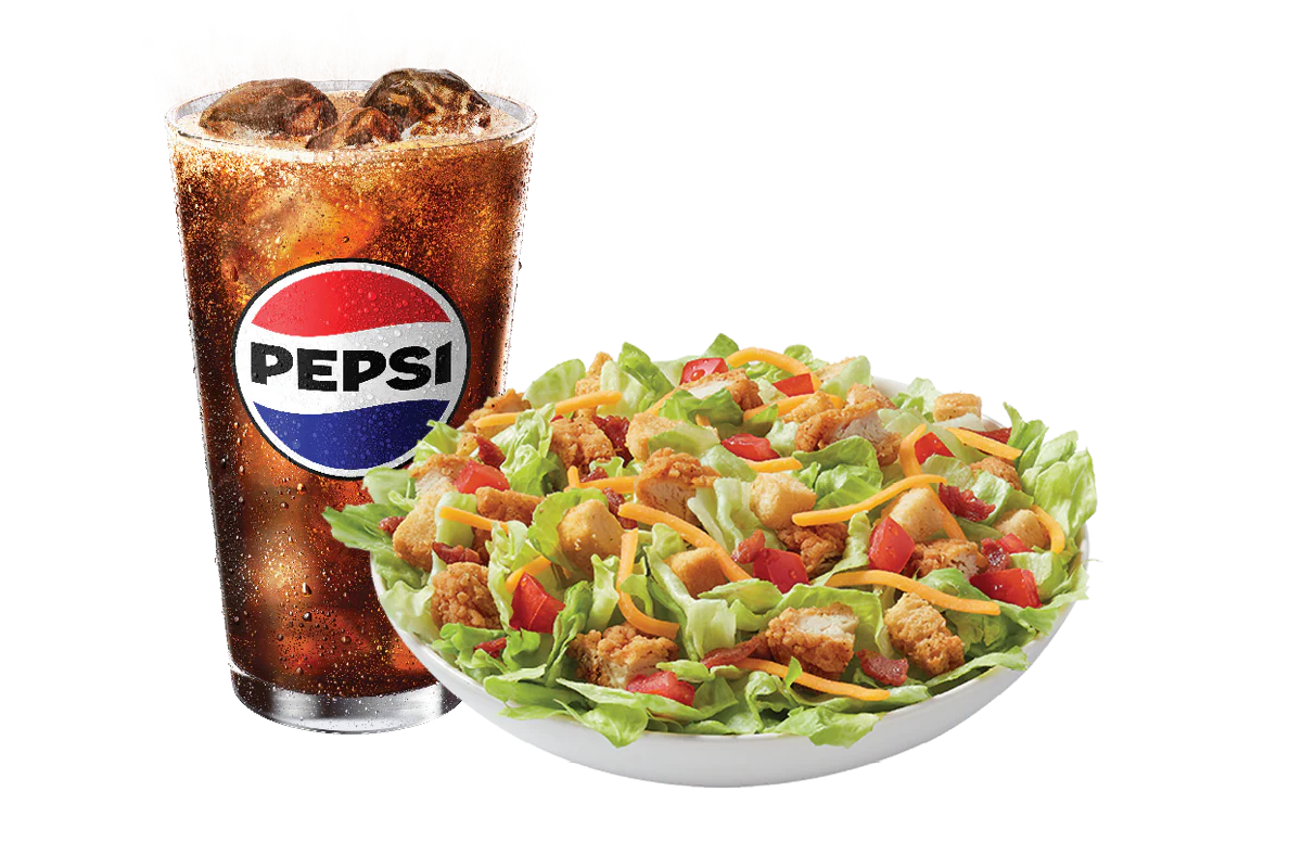 100% seasoned all-tenderloin crispy chicken strips served on top of a crisp bed of lettuce, diced tomatoes, bacon, shredded cheddar and croutons. Served with your choice of dressing. Includes your choice of 21oz drink. (Bacon bits may not be available at all locations) *Nutrition information does not include a dressing.