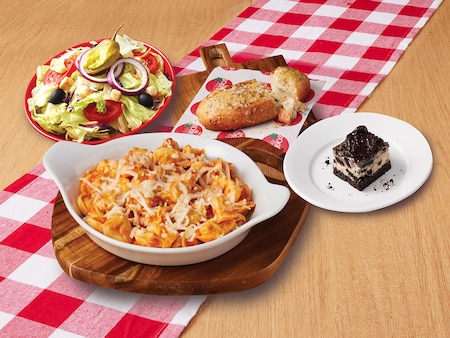 Pasta stuffed with ricotta cheese filling then baked with pizza mozzarella and tossed in rosé sauce. Includes your choice of drink and dessert.
