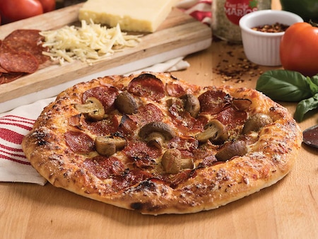 Loaded with pepperoni, crispy bacon and sliced button mushrooms.