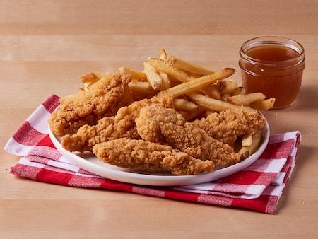 Crispy chicken tenders served with fries and plum sauce for dipping.