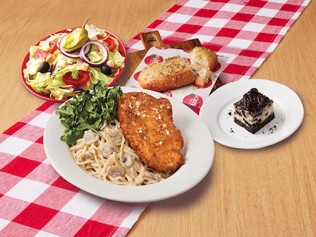Hand-breaded Chicken Parmigiana made fresh daily. Served with loads of spaghetti and Mario's Signature Tomato Sauce. Finish your meal with a mini oreo cheesecake.