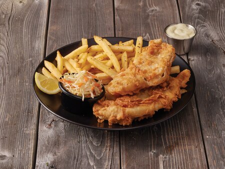 Two pieces of flaky white fish, beer-battered and cooked to a golden crisp. Served with tartar sauce, coleslaw and seasoned fries.