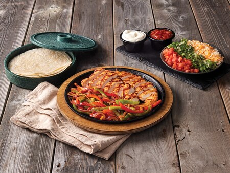 Sizzling hot strips of grilled seasoned chicken breast served with peppers, onions, cheddar cheese, diced tomatoes, lettuce, sour cream, salsa and flour tortillas.