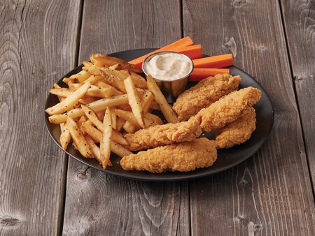 Crispy seasoned white-meat chicken strips, lightly breaded and served with seasoned fries and plum sauce. Served with carrot sticks.