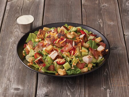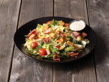 Crispy Romaine lettuce tossed in a buttermilk dill dressing and topped with cheddar cheese, maple bacon, green onions, cherry tomatoes, cucumbers, and seasoned croutons.