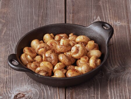 Sizzling whole mushrooms sauteéd in a garlicky wine sauce.