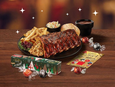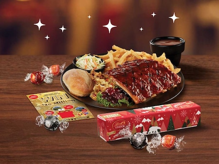 A half rack of BBQ back ribs basted in your choice of classic Smoky BBQ or sweet Honey Garlic served with creamy coleslaw, a dinner roll, your choice of side, stuffing, cranberry, and 5 LINDOR Chocolate Truffles. Plus, a Festive Scratch & Win Card* - everyone's a winner!