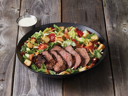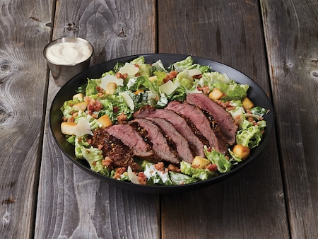 Crispy romaine lettuce, tossed in a garlic Caesar dressing and topped with a fire-grilled, seasoned 7oz sirloin steak; Parmesan cheese, croutons and bacon bits.