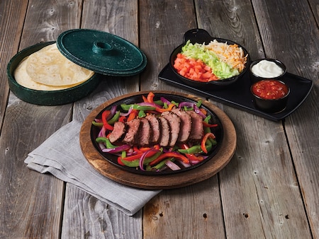 Sizzling hot strips of fire grilled, seasoned 7oz sirloin steak; served with peppers, onions, cheese, diced tomatoes, lettuce, sour cream, salsa and flour tortillas