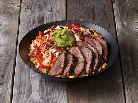Fire-grilled, seasoned 7oz sirloin steak on top of a bed of rice, roasted corn, beans, cheese, red peppers, guacamole, house-made Pico de Gallo and garnished with a creamy cilantro sauce and crunchy corn tortillas.