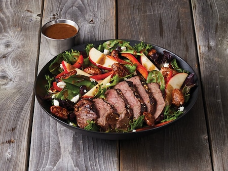 Fire-grilled, seasoned 7oz sirloin steak; goat cheese, red pepper strips, spicy pecans, apple slices and dried cranberries; on a bed of mixed field greens, tossed in balsamic vinaigrette.
