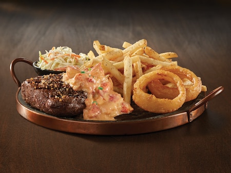 Tender, juicy 7oz top sirloin, aged for 50 days, seasoned to perfection, and fire-grilled to order. Topped with 2oz of tender lobster meat in creamy lobster sauce. Served with two onion rings, your choice of in-house baked beans or coleslaw, and your choice of seasoned fries, house salad, or baked potato. *Cannot guarantee steak doneness for take-out.