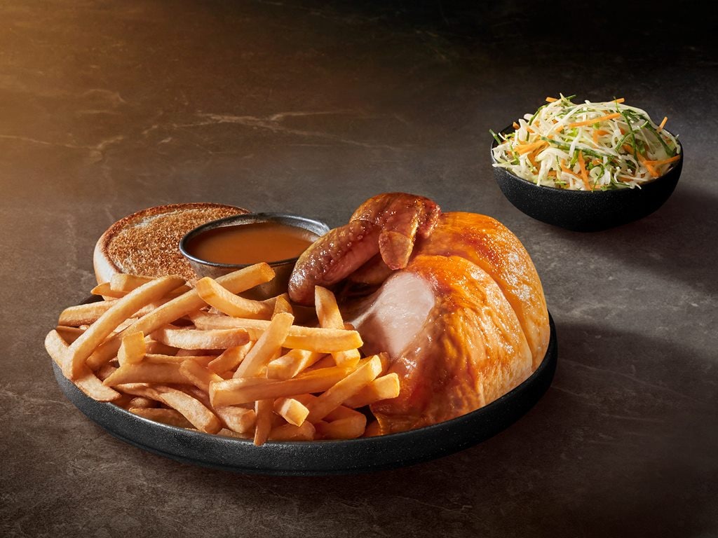 Our St-Hubert chicken, roasted roasted on the spit for three hours (choice of classic, Piri-piri, tikka masala or spicy asian sauce). This meal includes: • 1 chicken breast • 1 chicken leg • 1 serving of St-Hubert BBQ sauce • 2 buns • 1 serving of coleslaw Suggested serving.