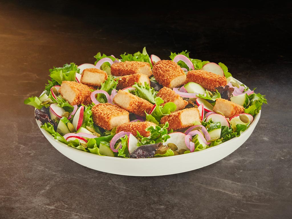 Mixed greens, radishes, cucumber, red onions, roasted pumpkin seeds and house dressing. Served with a choice of rotisserie chicken, grilled chicken breast or crispy chicken fillets. Suggested serving.