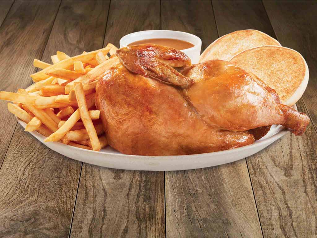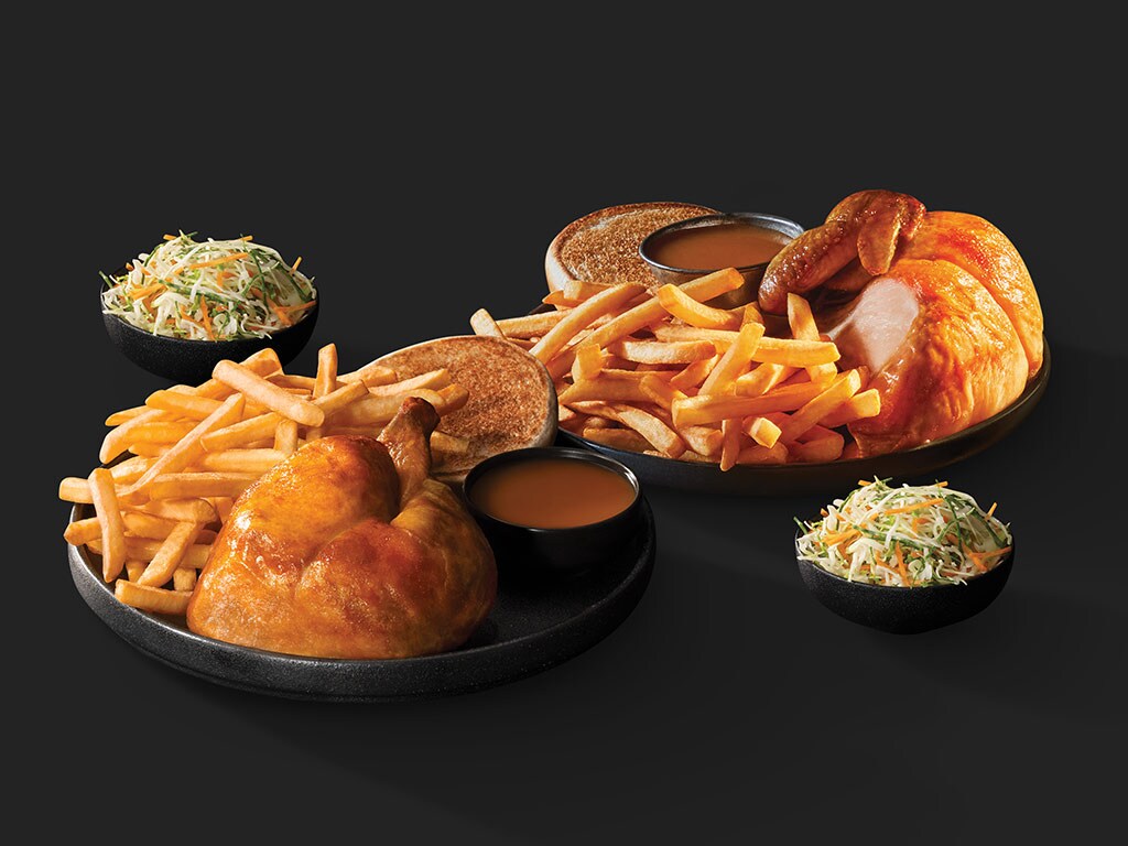 Our St-Hubert chicken, roasted roasted on the spit for three hours (choice of classic, Piri-piri, tikka masala or spicy asian sauce). This meal includes: • 1 chicken breast • 1 chicken leg • 1 serving of St-Hubert BBQ sauce • 2 buns • 1 serving of coleslaw Suggested serving.