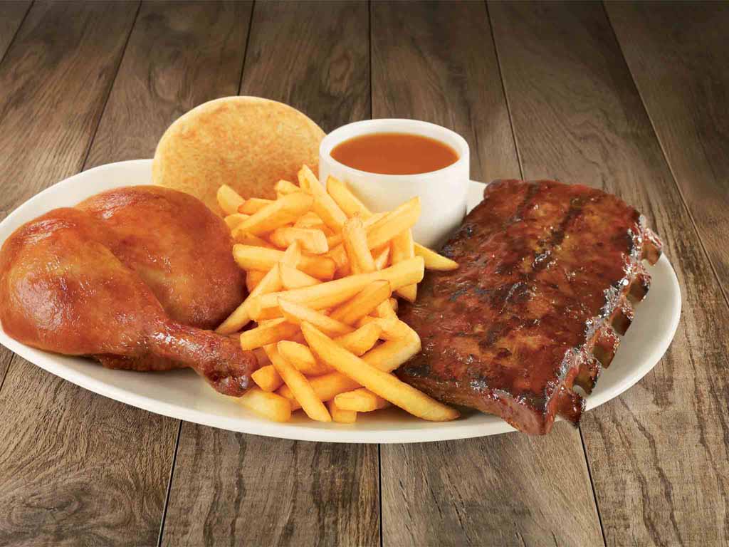 Our tender and meaty ribs combined with our authentic rotisserie chicken. This meal includes: • 1 half rack of ribs (your choice of classic, whisky BBQ, spicy asian or Jules' Apple Rib sauce) • 1 chicken breast (choice of classic, Piri-piri, tikka masala, or spicy asian sauce). • 1 side of your choice • 1 serving of St-Hubert BBQ sauce • 1 bun • 1 serving of coleslaw Suggested serving.