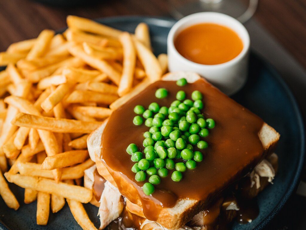 Pieces of rotisserie chicken (dark meat or choice of white meat for an extra $) served between two slices of bread and topped with hot chicken sauce and peas. This meal includes: • 1 side of your choice • 1 serving of coleslaw Suggested serving.
