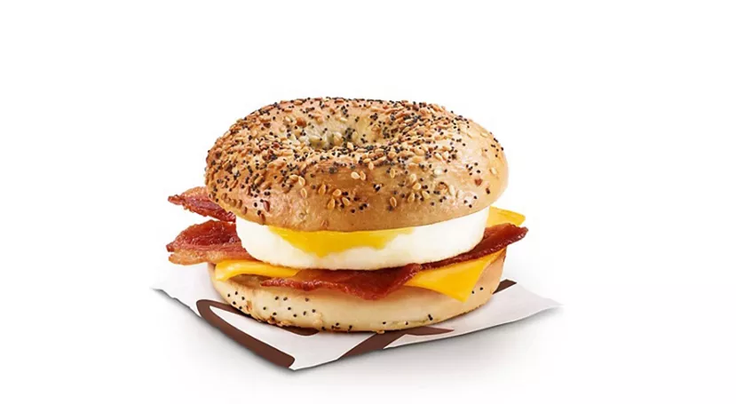 Enjoy an everything bagel, topped with hickory smoked bacon, a freshly cracked Canada Grade A egg and slice of processed cheese. Not available in Quebec.