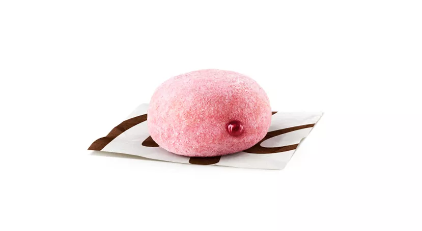 Mini pink powdered donut with a berries and cherry filling.