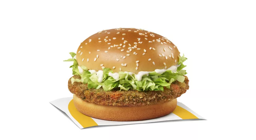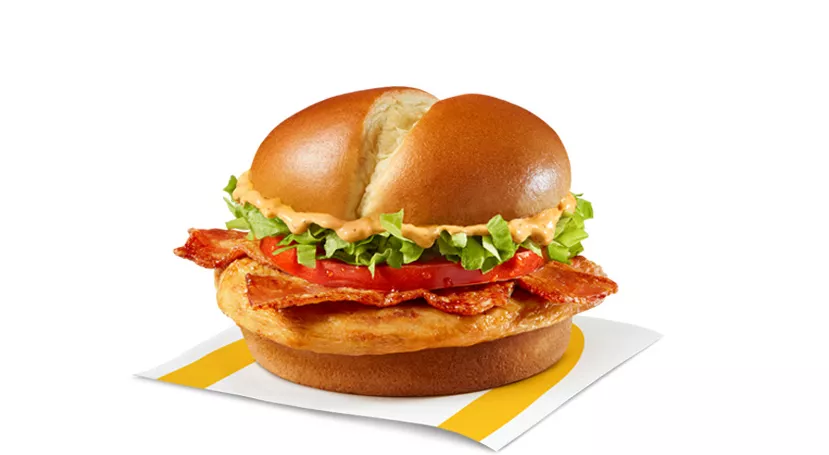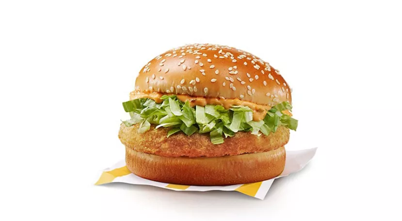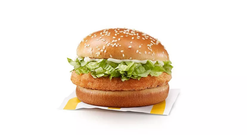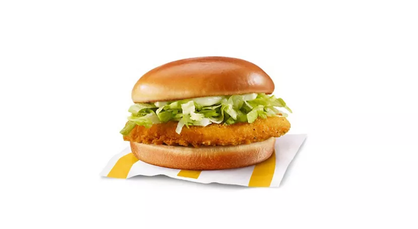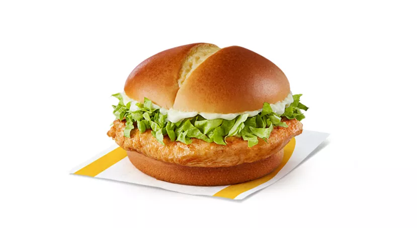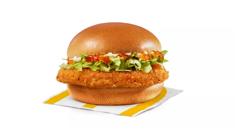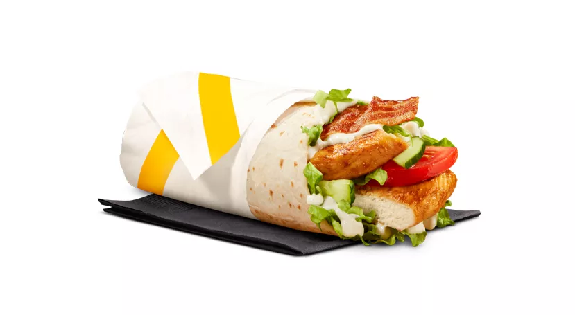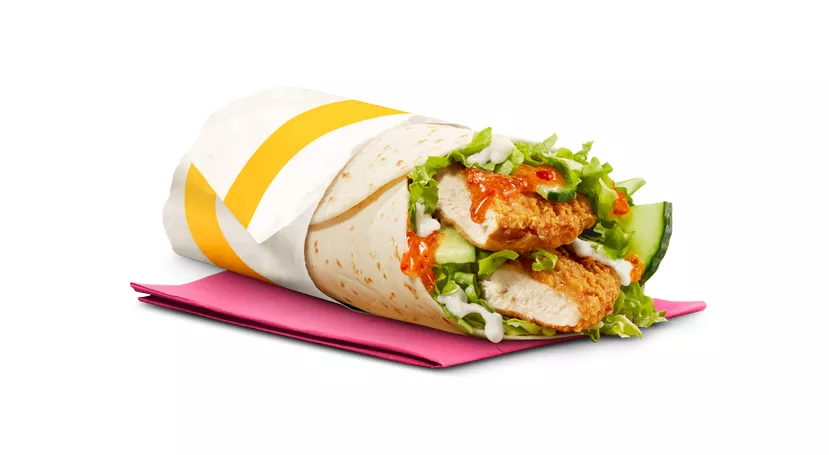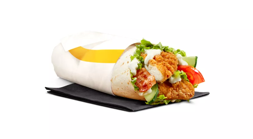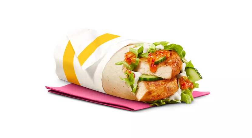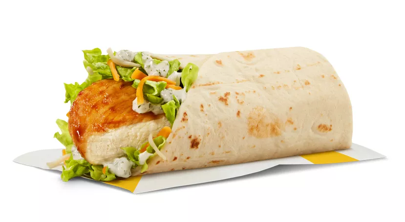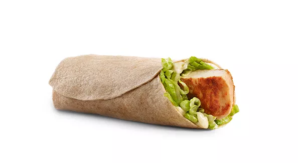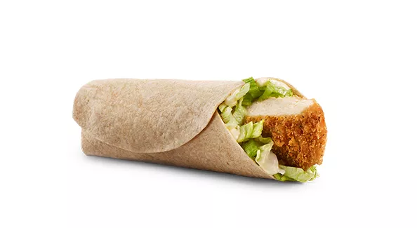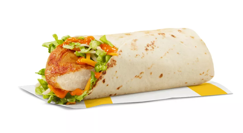 Made with a breaded seasoned chicken patty and processed cheese, topped with mayo-style sauce, shredded lettuce and a crispy hash brown, all wrapped in a soft white flour tortilla.