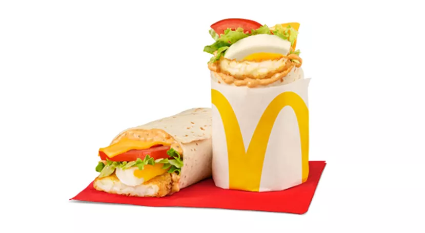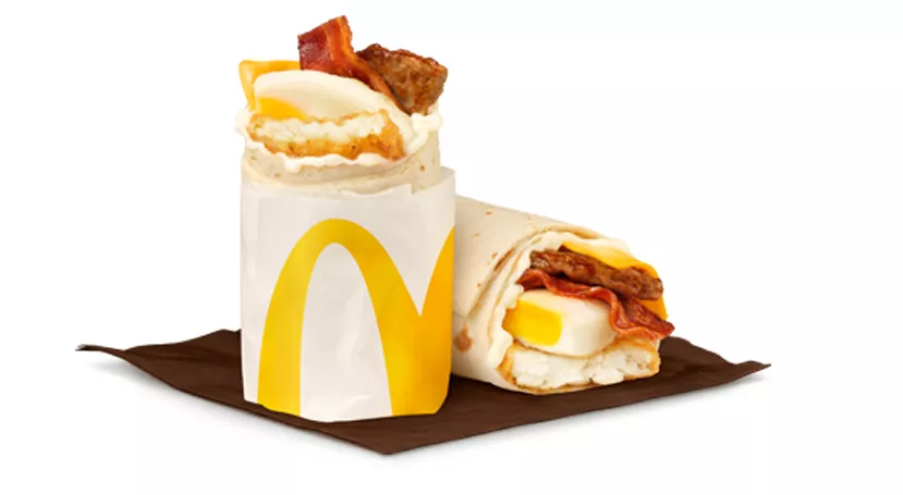 Made with savoury sausage, hickory-smoked bacon, a freshly-cracked Candian Free-Run Egg, and processed cheese, topped with mayo-style sauce and a crispy hash brown, all wrapped in a soft white flour tortilla.