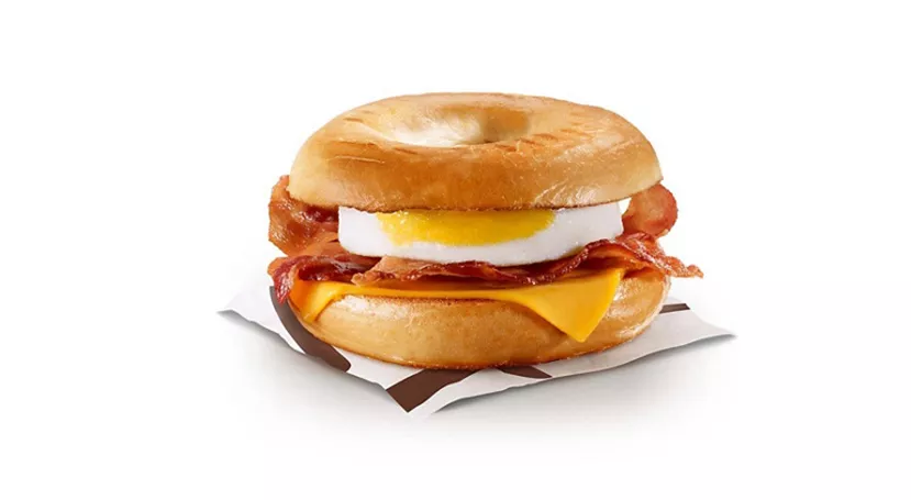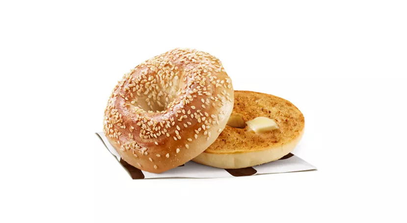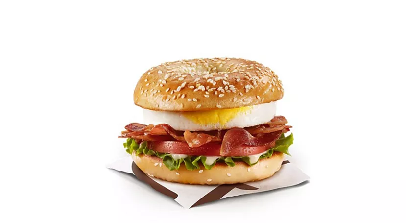 Enjoy a sesame bagel, topped with hickory smoked bacon, a freshly cracked Canada Grade A egg and slice of processed cheese.