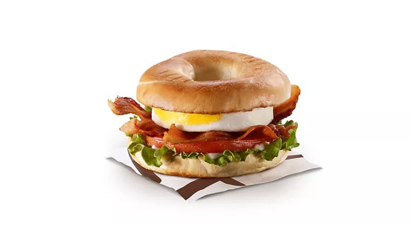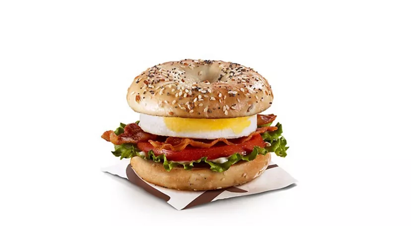 Made with an everything bagel, and topped with a freshly cracked Canada Grade A egg, hickory smoked bacon, sliced tomato and crisp lettuce. Not available in Quebec.