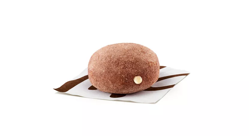 Mini donut with hazelnut filling, dusted with cocoa powder.