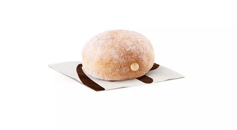 Mini powdered donut with white chocolate filling.