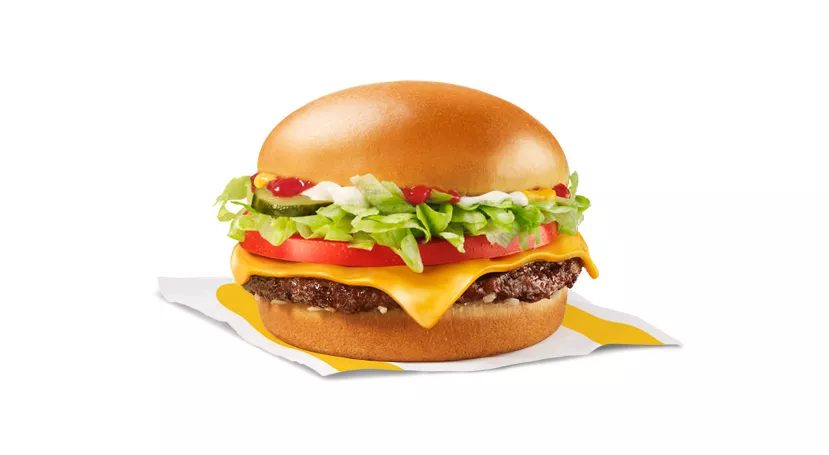 Our classic hamburger is made with juicy and delicious 100% Canadian beef and topped with pickles, sweet onions, ketchup, and mustard on a freshly toasted bun. Available with your choice of apple slices or mini/small fries, yogurt and small/child-size drink (as applicable).