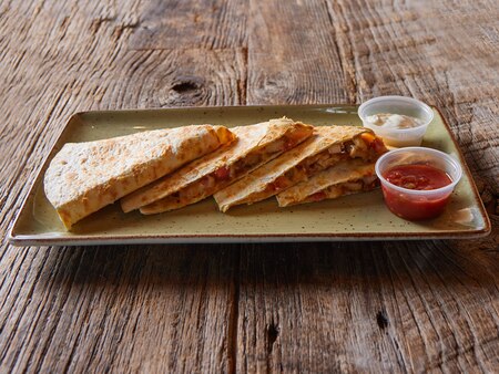 A baked chili-seasoned flour tortilla packed with our melted three-cheese blend, tomatoes, and jalapeños. Served with your choice of side and salsa and sour cream for dipping.